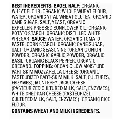 INGREDIENTS: Bagel Half: Organic Wheat Flour, Organic Whole Wheat Flour, Water, Organic Vital Wheat Gluten, Organic Cane Sugar, Salt, Yeast, Organic Expeller-Pressed Sunflower Oil, Organic Potato Starch, Organic Distilled White Vinegar, Sauce: Water, Organic Tomato Paste, Corn Starch, Organic Cane Sugar, Salt, Organic Seasoning (Organic Onion Powder, Organic Garlic Powder, Organic Basil, Organic Black Pepper, Organic Oregano, Topping: Organic Low Moisture Part Skim Mozzarella Cheese (Organic Pasteurized Part-Skim Milk, Salt, Cultures, Enzymes), Monterey Jack Cheese (Pasteurized Cultured Milk, Salt, Enzymes), White Cheddar Cheese (Pasteurized Cultured Milk, Salt, Enzymes), Organic Rice Flour.