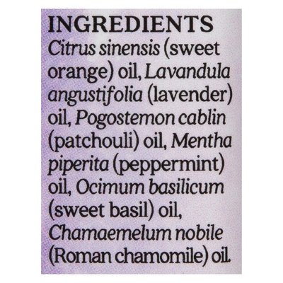 INGREDIENTS: Citrus Sinensis (Sweet Orange) Oil, Lavandula Angustifolia (Lavender) Oil, Pogostemon Cablin (Patchouli) Oil, Mentha Piperita (Peppermint) Oil, Ocimum Basilicum (Sweet Basil) Oil, Chamaemelum Nobile (Roman Chamomile) Oil.