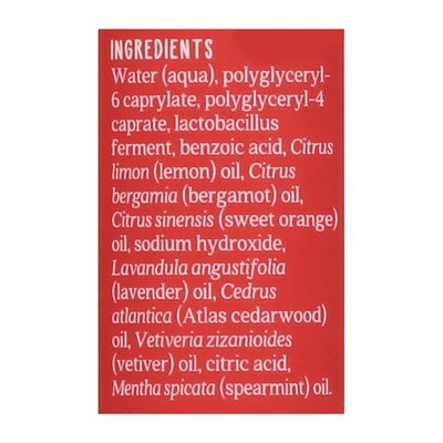 INGREDIENTS: Water (Aqua), Polyglyceryl-6 Caprylate, Polyglyceryl-4 Caprate, Lactobacillus Ferment, Benzoic Acid, Citrus Limon (Lemon) Oil, Citrus Bergamia (Bergamot) Oil, Citrus Sinensis (Sweet Orange) Oil, Sodium Hydroxide, Lavandula Angustifolia (Lavender) Oil, Cedrus Atlantica (Atlas Cedarwood) Oil, Vetiveria Zizanioides (Vetiver) Oil, Citric Acid, Mentha Spicata (Spearmint) Oil.