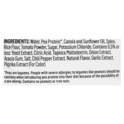 INGREDIENTS: Water, Pea Protein (Peas Are Legumes), Rice Protein, 2% or Less of Spices (with Chili Pepper), Faba Bean Protein, Natural Flavors, Potato Starch, Expeller-Pressed Canola Oil, Inulin, Garlic Powder, Pomegranate Concentrate, Citric Acid, Salt, Yeast Extract, Tomato Powder, Onion Powder, Paprika Extract Color.
