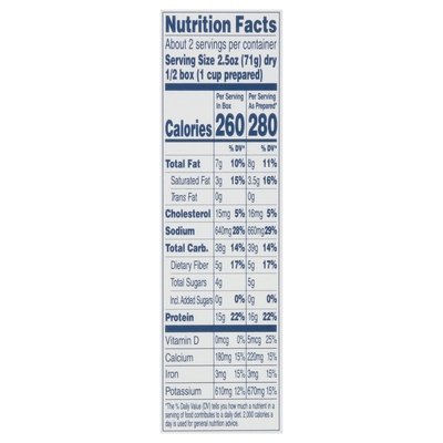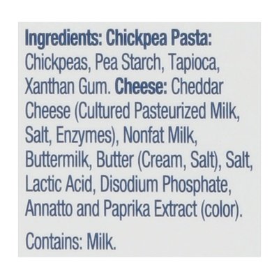 INGREDIENTS: Chickpea Pasta: Chickpeas, Pea Starch, Tapioca, Xanthan Gum, Cheese: Cheddar Cheese (Cultured Pasteurized Milk, Salt, Enzymes), Nonfat Milk, Buttermilk, Butter (Cream, Salt), Salt, Lactic Acid, Disodium Phosphate, Annatto and Paprika Extract (Color).