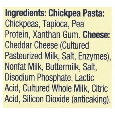 INGREDIENTS: Chickpea Pasta: Chickpeas, Tapioca, Pea Protein, Xanthan Gum, Cheese: Cheddar Cheese (Cultured Pasteurized Milk, Salt, Enzymes), Nonfat Milk, Buttermilk, Salt, Disodium Phosphate, Lactic Acid, Cultured Whole Milk, Citric Acid, Silicon Dioxide (Anticaking).
