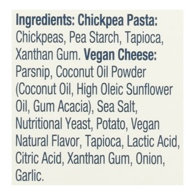 INGREDIENTS: Chickpea Pasta: Chickpeas, Pea Starch, Tapioca, Xanthan Gum, Vegan Cheese: Parsnip, Coconut Oil Powder (Coconut Oil, High Oleic Sunflower Oil, Gum Acacia), Sea Salt, Nutritional Yeast, Potato, Vegan Natural Flavor, Tapioca, Lactic Acid, Citric Acid, Xanthan Gum, Onion, Garlic.