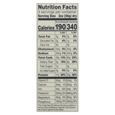 PRODUCT DETAILS: 20 g protein (per 3.5 oz serving). 8 g fiber (per 3.5 oz serving). 20 g protein. Vegan. Certified gluten free. gfco.org. Gluten-free. 50% more protein. 3x fiber. 25% fewer net carbs (net carbs = total carbs - dietary fiber) compared to the leading average pasta. Non-GMO Project verified. nongmoproject.org. Powered by chickpeas. Why make pasta out of chickpeas? Because we want to eat more pasta! So, we thought, why not use chickpeas to make pasta that's nutrient-dense, protein-packed, good-for-the-planet, and delicious? We can keep going but your water is probably boiling and your sauce is likely a-simmering. Go ahead, finish cooking, we'll see you again soon. Low glycemic index. EatBanza.com. how2recycle.info. (at)EatBanza. Look for our pizza, mac, and rice in a store near you! Made at our plant in Riverside, California.