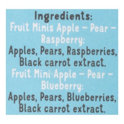 INGREDIENTS: Fruit Mini Apple-Pear Blueberry: Apples, Pears, Blueberries, Black Carrot Extract. Fruit Minis Apple-Pear Raspberry: Apples, Pears, Raspberries, Black Carrot Extract.
