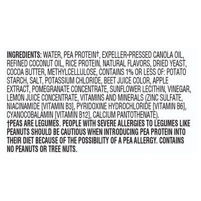 INGREDIENTS: Water, Pea Protein (Peas Are Legumes. People with Severe Allergies to Legumes Like Peanuts Should Be Cautions When Introducing Pea Protein Into Their Diet Because of the Possibility of a Pea Allergy), Expeller-Pressed Canola Oil, Refined Coconut Oil, Rice Protein, Natural Flavors, Dried Yeast, Cocoa Butter, Methylcellulose, Contains 1% or Less: Potato Starch, Salt, Potassium Chloride, Beet Juice Color, Apple Extract, Pomegranate Concentrate, Sunflower Lecithin, Vinegar, Lemon Juice Concentrate, Vitamins and Minerals (Zinc Sulfate, Niacinamide [Vitamin B3], Pyridoxine Hydrochloride [Vitamin B6], Cyanocobalamin [Vitamin B12], Calcium Pantothenate).