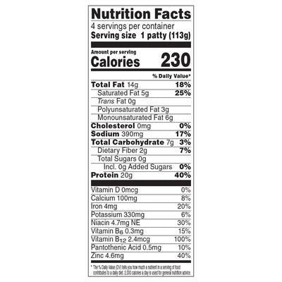 PRODUCT DETAILS: 20 g of protein per serving. Vegetarian Society: Vegan Approved. No gluten. Halal. Contains no peanuts or tree nuts. 35% Less saturated fat than a 4 oz patty of 80/20 ground beef. See nutrition information for fat and saturated fat content. No soy. Saturated fat comparison for 4 oz (raw): 8 g / Beyond Burger: 5 g. Non-GMO Project verified. nongmoproject.org. New look. how2recycle.info. www.beyondmeat.com. Scan to go Beyond: The positive choices we make every day - no matter how small - can have a great impact on ourselves and the planet. At Beyond, we've taken the animal off the table, while still delivering the meaty, plant-based, better-for-you meals you crave. Ethan Brown, Founder and CEO.