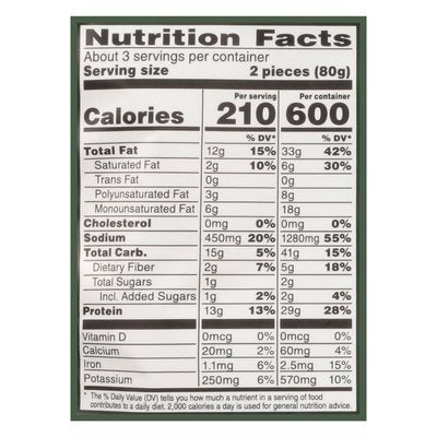 PRODUCT DETAILS: Plant-based breaded tenders. 13 g of protein per serving. Vegan: Vegetarian Society Approved. Halal: Islamic Services of America. 50% less saturated fat than the leading brand of traditional breaded chicken nuggets. Saturated fat comparison per serving leading brand of breaded chicken nuggets (90 g): 4 g. Beyond chicken tenders (80 g): 2 g. Non-GMO Project verified. nongmoproject.org. New look. www.beyondmeat.com. how2recycle.info. Scan to go Beyond: The positive choices we make every day - no matter how small - can have a great impact on ourselves and the planet. At the Beyond, we've taken the animal off the table, while still delivering the meaty, plant-based, better-for-you meals you crave. Ethan Brown, Founder and CEO. Resealable.