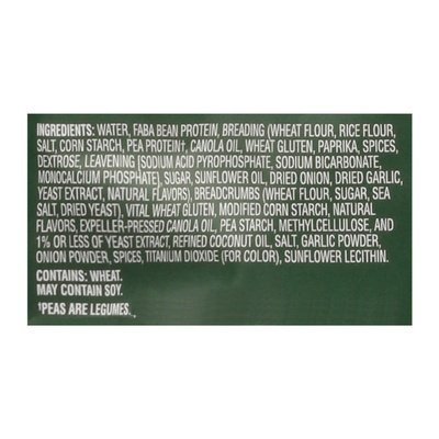 INGREDIENTS: Water, Faba Bean Protein, Breading (Wheat Flour, Rice Flour, Salt, Corn Starch, Pea Protein (Peas Are Legumes, People with Severe Allergies to Legumes Like Peanuts Should Be Cautious When Introducing Pea Protein Into Their Diet Because of the Possibility of a Pea Allergy), Canola Oil, Wheat Gluten, Paprika, Spices, Dextrose, Leavening [Sodium Acid Pyrophosphate, Sodium Bicarbonate, Monocalcium Phosphate], Sugar, Sunflower Oil, Dried Onion, Dried Garlic, Yeast Extract, Natural Flavors), Breadcrumbs (Wheat Flour, Sugar, Sea Salt, Dried Yeast, Vital Wheat Gluten, Modified Corn Starch, Natural Flavors, Expeller-Pressed Canola Oil, Pea Starch, Methylcellulose, and 1% or Less of Yeast Extract, Refined Coconut Oil, Salt, Garlic Powder, Onion Powder, Sodium Phosphates, Spices, Titanium Dioxide (for Color), Sunflower Lecithin.