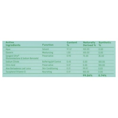 INGREDIENTS: Active Ingredients: Aqua; Function: Solvent; Content %: 97.58; Naturally Derived %: 100; Synthetic %: 0. Active Ingredients: Glycerin; Function: Moisturizing; Content %: 1; Naturally Derived %: 100; Synthetic %: 0. Active Ingredients: Geogard Ultra (Gluconolactone & Sodium Benzoate); Function: Preservative; Content %: 0.90; Naturally Derived %: 75; Synthetic %: 25. Active Ingredients: Sodium Citrate; Function: Buffering/pH Control; Content %: 0.45; Naturally Derived %: 0; Synthetic %: 100. Active Ingredients: Citric Acid; Function: Preservative; Content %: 0.07; Naturally Derived %: 0; Synthetic %: 100. Active Ingredients: Aloe Barbadensis Leaf Juice; Function: Skin Conditioning; Content %: 0.01; Naturally Derived %: 99.97; Synthetic %: 0.03. Active Ingredients: Tocopherol (Vitamin E); Function: Nourishing; Content %: 0.01; Naturally Derived %: 100; Synthetic %: 0.