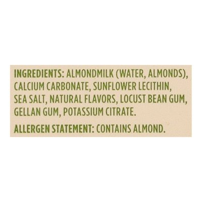INGREDIENTS: Almondmilk (Water, Almonds), Calcium Carbonate, Sunflower Lecithin, Sea Salt, Natural Flavors, Locust Bean Gum, Gellan Gum, Potassium Citrate.