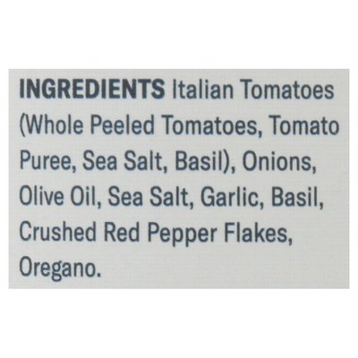INGREDIENTS: Imported Italian Tomatoes (Whole Peeled Tomatoes, Tomato Puree, Sea Salt, Basil), Onions, Olive Oil, Sea Salt, Garlic, Basil, Crushed Red Pepper Flakes, Oregano.