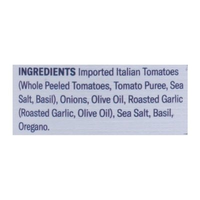 INGREDIENTS: Imported Italian Tomatoes (Whole Peeled Tomatoes, Tomato Puree, Sea Salt, Basil), Onions, Olive Oil, Roasted Garlic (Roasted Garlic, Olive Oil), Sea Salt, Basil, Oregano.