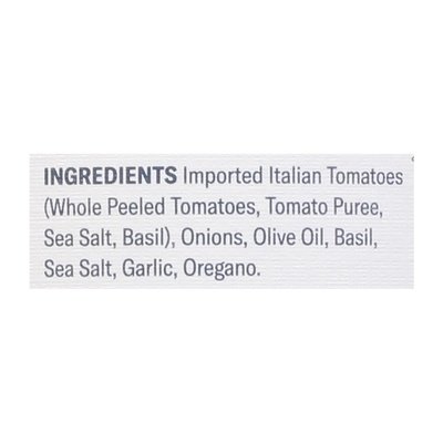 INGREDIENTS: Imported Italian Tomatoes (Whole Peeled Tomatoes, Tomato Puree, Sea Salt, Basil), Onion, Olive Oil, Basil, Sea Salt, Garlic, Oregano.
