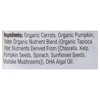 INGREDIENTS: Organic Carrot, Organic Pumpkin Water, Organic Nutrient Blend (Organic Tapioca Fiber Nutrients Derived from [Spinach, Squash Seed, Kelp, Maitake Mushroom, Chlorella, Sunflower Seed]), DHA Algal Oil.