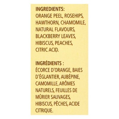 INGREDIENTS: Orange Peel, Rosehips, Hawthorn, Chamomile, Natural Flavours, Blackberry Leaves, Hibiscus, Peaches, Citric Acid.