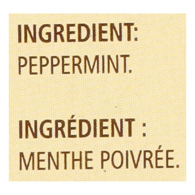 PRODUCT DETAILS: Gluten free. Caffeine free. Non-GMO Project verified. nongmoproject.org. Please use this number in all correspondence related to this product. The aromatic Oregon- and Washington-grown peppermint we've selected for this tea tastes so fresh and delicious that it requires no accompaniment - it's the only ingredient here. Once reserved for exclusive use in cakes and candies, the whistling cool freshness of pure peppermint from the great Pacific Northwest is yours to enjoy in this comforting brew. www.celetialseasonings.ca. Comments or questions: 1-800-351-8175. www.celetialseasonings.ca. 100% recycled. We print our boxes on 100% recycled paper board (35% post-consumer material). Blended with care from seed to sip. Responsible sourcing. We purchase most of our ingredients directly from the farming communities that grow them. Sustainable Packaging: We use a tea bags for this product without strings, tags or staples, keeping tons of material out of landfills every year.
