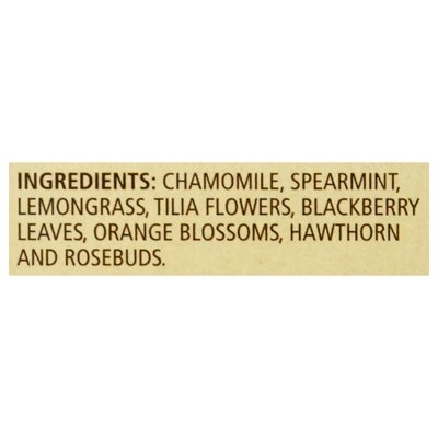 INGREDIENTS: Chamomile, Spearmint, Lemongrass, Tilia Flowers, Blackberry Leaves, Orange Blossoms, Hawthorn and Rosebuds.