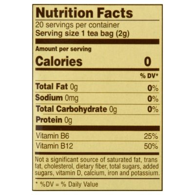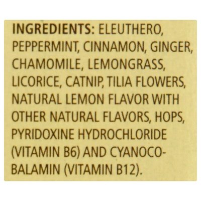 INGREDIENTS: Eleuthero, Peppermint, Cinnamon, Ginger, Chamomile, Lemongrass, Licorice, Catnip, Tilia Flowers, Natural Lemon Flavor with Other Natural Flavors, Hops, Pyridoxine Hydrochloride (Vitamin B6) and Cyanocobalamin (Vitamin B12).