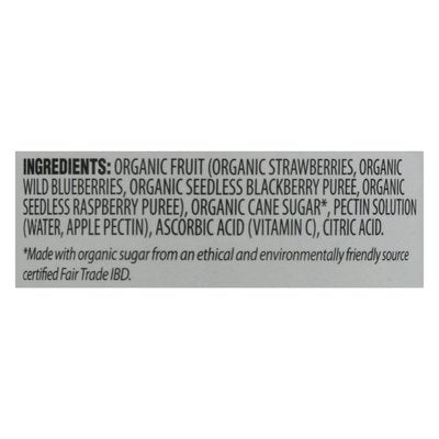 INGREDIENTS: Organic Fruit (Organic Strawberries, Organic Wild Blueberries, Organic Seedless Blackberry Puree, Organic Seedless Raspberry Puree), Organic Cane Sugar (Made with Organic Sugar from an Ethical and Environmentally Friendly Source Certified Fair Trade Ibd), Pectin Solution (Water, Apple Pectin), Ascorbic Acid (Vitamin C), Citric Acid.