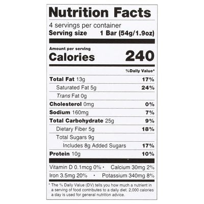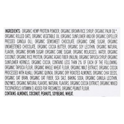 INGREDIENTS: Organic Hemp Protein Powder, Organic Brown Rice Syrup, Organic Palm Oil (Sustainably Sourced), Organic Rolled Oats, Organic Vegetable Oil (Organic Sunflower and/or Organic Expeller Pressed Canola Oil), Organic Semisweet Chocolate (Organic Cane Sugar, Organic Unsweetened Chocolate, Organic Cocoa Butter, Organic Soy Lecithin, Organic Natural Flavor), Organic Brown Sugar (Organic Cane Sugar, Organic Molasses), Water, Organic Coconut, Organic Rice Protein, Organic Agave Fiber (Inulin), Organic Tapioca Syrup, Organic Sunflower Kernels, Organic Cocoa, Contains Less than 2% of Each of the Following: Organic Tapioca Flour, Organic Whole Wheat Flour, Organic Malt Extract, Organic Cocoa Processed with Alkali, Organic Quinoa, Organic Dry Roasted Almonds, Organic Chia Seeds, Organic Oat Bran, Organic Oat Fiber, Sea Salt, Baking Soda, Organic Canola Lecithin, Enzymes, Organic Natural Flavors, Natural Flavors, Organic Cocoa Extract, Organic Mixed Tocopherols (Vitamin E) Added for Freshness, Organic Peanut Flour.