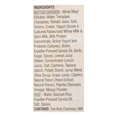 INGREDIENTS: Butter Chicken - White Meat Chicken, Water, Tomatoes (Tomatoes, Tomato Juice, Salt), Onions, Cream, Yogurt (Grade A Cultured Pasteurized Whole Milk & Skim Milk, Milk Protein Concentrate, Active Yogurt and Probiotic Cultures), Butter, Expeller-Pressed Canola Oil, Garlic, Sugar, Spices, Lemon Juice (Water, Concentrated Lemon Juice), Salt, Cashews, Tapioca Starch, Potato Starch, Syrup Blend (Rice Syrup, Grape Juice), Cilantro, Natural Flavor (Yeast Extract, Natural Flavor), Paprika Oleoresin, Vinegar, Mango Powder. Rice - Water, Basmati Rice, Expeller-Pressed Canola Oil, Salt, Spices.