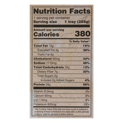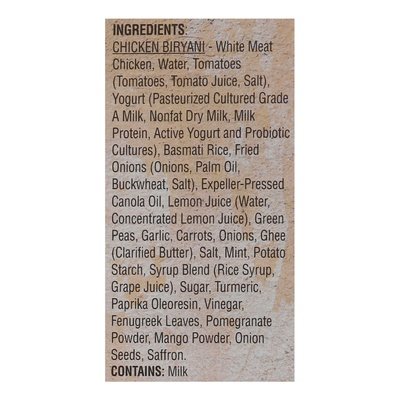 INGREDIENTS: Chicken Biryani - Water, White Meat Chicken, Yogurt (Pasteurized Cultured Grade A Milk, Nonfat Dry Milk, Milk Protein, Active Yogurt and Probiotic Cultures), Basmati Rice, Fried Onions (Onions, Palm Oil, Buckwheat, Salt), Expeller-Pressed Canola Oil, Spices, Green Peas, Lemon Juice (Water, Concentrated Lemon Juice), Carrots, Garlic, Ghee (Clarified Butter), Onions, Salt, Mint, Potato Starch, Syrup Blend (Rice Syrup, Grape Juice), Sugar, Turmeric, Paprika Oleoresin, Vinegar, Fenugreek Leaves, Pomegranate Powder, Mango Powder, Onion Seeds, Saffron.