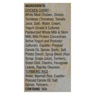 INGREDIENTS: Chicken Curry - White Meat Chicken, Onions, Tomatoes (Tomatoes, Tomato Juice, Salt), Water, Cream, Yogurt (Grade A Cultured Pasteurized Whole Milk & Skim Milk, Milk Protein Concentrate, Active Yogurt and Probiotic Cultures), Expeller- Pressed Canola Oil, Spices, Garlic, Salt, Potato Starch, Syrup Blend (Rice Syrup, Grape Juice), Turmeric, Green Chili, Cilantro, Fenugreek Leaves, Paprika Oleoresin, Turmeric Rice - Water, Basmati Rice, Expeller- Pressed Canola Oil, Salt, Spices, Turmeric.