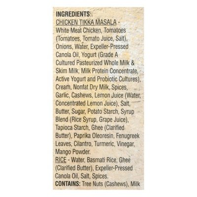 INGREDIENTS: Chicken Tikka Masala - White Meat Chicken, Tomatoes (Tomatoes, Tomato Juice, Salt), Onions, Water, Expeller-Pressed Canola Oil, Yogurt (Grade A Cultured Pasteurized Whole Milk & Skim Milk, Milk Protein Concentrate, Active Yogurt and Probiotic Cultures), Cream, Nonfat Dry Milk, Spices, Garlic, Cashews, Lemon Juice (Water, Concentrated Lemon Juice), Salt, Butter, Sugar, Potato Starch, Syrup Blend (Rice Syrup, Grape Juice), Tapioca Starch, Ghee (Clarified Butter), Paprika Oleoresin, Fenugreek Leaves, Cilantro, Turmeric, Vinegar, Mango Powder. Rice -Water, Basmati Rice, Ghee (Clarified Butter), Expeller-Pressed Canola Oil, Salt, Spices.