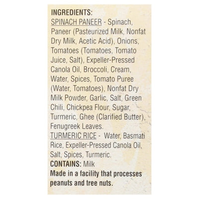 INGREDIENTS: Spinach Paneer - Spinach, Paneer (Pasteurized Milk, Nonfat Dry Milk, Acetic Acid), Onions, Tomatoes (Tomatoes, Tomato Juice, Salt), Expeller-Pressed Canola Oil, Broccoli, Cream, Water, Spices, Tomato Puree (Water, Tomatoes), Nonfat Dry Milk Powder, Garlic, Salt, Green Chili, Chickpea Flour, Sugar, Turmeric, Ghee (Clarified Butter), Fenugreek Leaves, Turmeric Rice - Water, Basmati Rice, Expeller-Pressed Canola Oil, Salt, Spices, Turmeric.
