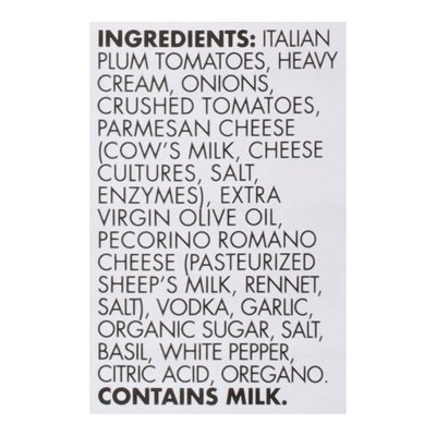 INGREDIENTS: Italian Plum Tomatoes, Heavy Cream, Onions, Crushed Tomatoes, Parmesan Cheese (Cow's Milk, Cheese Cultures, Salt, Enzymes), Extra Virgin Olive Oil, Pecorino Romano Cheese (Pasteurized Sheep's Milk, Rennet, Salt), Vodka, Garlic, Organic Sugar, Salt, Basil, White Pepper, Citric Acid, Oregano.