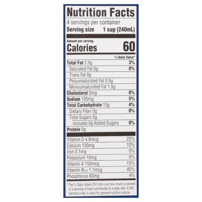 PRODUCT DETAILS: Plant-based beverage. 60 calories per serving. USDA Organic. Certified gluten free. gfco.org. Lactose and dairy free. Certified Organic by Quality Assurance International (QAI). Calcium & vitamin D. Good source of calcium and excellent source of vitamin D. Non-GMO Project verified. nongmoproject.org. The perfect plant milk. The Perfect Plant Milk? Smooth and delicious and unsweetened. The dream milk should - Make your cereal shine and your smoothie sing. It should taste straight up delicious in a glass, any time of day. And while we're at it, it should add a boost of calcium and vitamin D. What's the use of dreaming, if you are going to settle for less? Dream big. Never cowpromise. www.dreamplantbased.com. Questions or comments? 1-866-481-1002. For more information on the Dream family of products and for delicious ideas, please visit our website at: www.dreamplantbased.com. Tetra Pak: Protects what's good. Tetra Brik Aseptic. FSC: Mix - Board. Please recycle. recyclecartons.com.