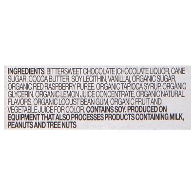 INGREDIENTS: Bittersweet Chocolate (Chocolate Liquor, Cane Sugar, Cocoa Butter, Soy Lecithin, Vanilla), Organic Sugar, Organic Red Raspberry Puree, Organic Tapioca Syrup, Organic Glycerin, Organic Lemon Juice Concentrate, Organic Natural Flavors, Organic Locust Bean Gum, Organic Fruit and Vegetable Juice for Color.