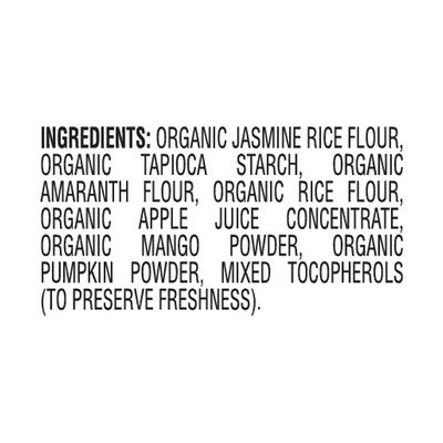 INGREDIENTS: Organic Jasmine Rice Flour, Organic Tapioca Starch, Organic Amaranth Flour, Organic Rice Flour, Organic Apple Juice Concentrate, Organic Mango Powder, Organic Pumpkin Powder, Mixed Tocopherols (to Preserve Freshness).