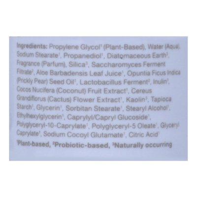 INGREDIENTS: Propylene Glycol (Plant-Based) (Plant-Based), Water (Aqua) Sodium Stearate (Plant-Based), Propanediol (Plant-Based), Diatomaceous Earth (Naturally Occurring), Fragrance (Parfum), Silica (Naturally Occurring), Saccharomyces Ferment Filtrate (Probiotic-Based), Aloe Barbadensis Leaf Juice (Plant-Based), Opuntia Ficus Indica (Prickly Pear) Seed Oil (Plant-Based), Lactobacillus Ferment (Probiotic-Based), Inulin (Plant-Based), Cocos Nucifera (Coconut) Fruit Extract (Plant-Based), Cereus Grandiflorus (Cactus) Flower Extract (Plant-Based), Kaolin (Naturally Occurring), Tapioca Starch (Plant-Based), Glycerin (Plant-Based), Sorbitan Stearate (Plant-Based), Stearyl Alcohol (Plant-Based), Ethylhexylglycerin (Plant-Based), Caprylyl/Capryl Glucoside (Plant-Based), Polyglyceryl-10-Caprylate (Plant-Based), Polyglyceryl-5 Oleate (Plant-Based), Glyceryl Caprylate (Plant-Based), Sodium Cocoyl Glutamate (Plant-Based), Citric Acid (Plant-Based).