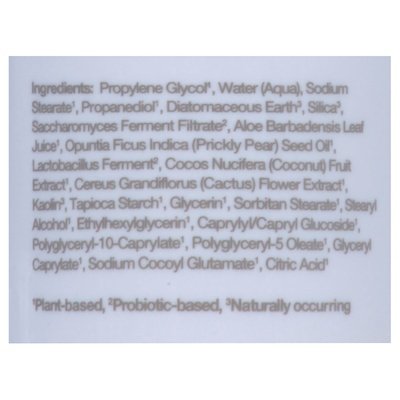 INGREDIENTS: Propylene Glycol (Plant-Based), Water (Aqua), Sodium Stearate (Plant-Based), Propanediol (Plant-Based), Diatomaceous Earth (Naturally Occurring), Silica (Naturally Occurring), Saccharomyces Ferment Filtrate (Probiotic-Based), Aloe Barbadenisis Leaf Juice (Plant-Based), Opuntia Ficus Indica (Prickly Pear) Seed Oil (Plant-Based), Lactobacillus Ferment (Probiotic-Based), Cocos Nucifera (Coconut) Fruit Extract (Plant-Based), Cereus Grandiflorus (Cactus) Flower Extract (Plant-Based), Kaolin (Naturally Occurring), Tapioca Starch (Plant-Based), Glycerin (Plant-Based), Sorbitan Stearate (Plant-Based), Stearyl Alcohol (Plant-Based), Ethylhexylglycerin (Plant-Based), Caprylyl/Capryl Glucoside (Plant-Based), Polyglyceryl-10caprylate (Plant-Based), Polyglyceryl-5 Oleate (Plant-Based), Glyceryl Caprylate (Plant-Based), Sodium Cocoyl Glutamate (Plant Based), Citric Acid (Plant-Based).