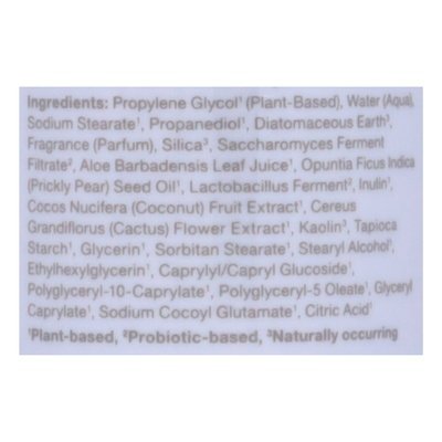 INGREDIENTS: Propylene Glycol (Plant-Based), Water (Aqua), Sodium Stearate (Plant-Based), Propanediol (Plant-Based), Diatomaceous Earth (Naturally Occurring), Fragrance (Parfum), Silica (Naturally Occurring), Saccharomyces Ferment Filtrate (Probiotic-Based), Aloe Barbadensis Leaf Juice (Plant-Based), Opuntia Ficus Indica (Prickly Pear) Seed Oil (Plant-Based), Lactobacillus Ferment (Probiotic-Based), Inulin (Plant-Based), Cocos Nucifera (Coconut) Fruit Extract (Plant-Based), Cereus Grandiflorus (Cactus) Flower Extract (Plant-Based), Kaolin (Naturally Occurring), Tapioca Starch (Plant-Based), Glycerin (Plant-Based), Sorbitan Stearate (Plant-Based), Stearyl Alcohol (Plant-Based), Ethylhexylglycerin (Plant-Based), Caprylyl/Capryl Glucoside (Plant-Based), Polyglyceryl-10-Caprylate (Plant-Based), Polyglyceryl-5 Oleate (Plant-Based), Glyceryl Caprylate (Plant-Based), Sodium Cocoyl Glutamate (Plant-Based), Citric Acid (Plant-Based).