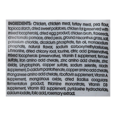 INGREDIENTS: Chicken, Chicken Meal, Turkey Meat, Pea Flour, Tapioca Starch, Dried Sweet Potatoes, Chicken Fat (Preserved with Mixed Tocopherols), Dried Egg Product, Chicken Broth, Flaxseeds, Dried Tomato Pomace, Dried Peas, Ground Miscanthus Grass, Salt, Potassium Chloride, Dicalcium Phosphate, Fish Oil, Monosodium Phosphate, Natural Flavor, Sodium Carboxymethylcellulose, L-Threonine, Dried Chicory Root, Taurine, Citric Acid (Preservative), Mixed Tocopherols (Preservative), Vitamin E Supplement, Ferrous Sulfate, Iron Amino Acid Chelate, Zinc Amino Acid Chelate, Zinc Oxide, L-Tryptophan, Copper Sulfate, Sodium Selenite, Niacin Supplement, D-Calcium Pantothenate, Copper Amino Acid Chelate, Manganese Amino Acid Chelate, Riboflavin Supplement, Vitamin A Supplement, Manganous Oxide, Dried Bacillus Coagulans Fermentation Product, Thiamine Mononitrate, Vitamin D3 Supplement, Vitamin B12 Supplement, Pyridoxine Hydrochloride, Calcium Iodate, Folic Acid, Rosemary Extract.