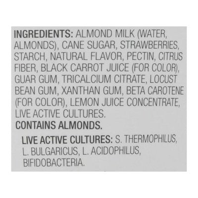 INGREDIENTS: Almond Milk (Water, Almonds), Cane Sugar, Strawberries, Starch, Natural Flavor, Pectin, Citrus Fiber, Black Carrot Juice (for Color), Guar Gum, Tricalcium Citrate, Locust Bean Gum, Xanthan Gum, Beta Carotene (for Color), Lemon Juice Concentrate, Live Active Cultures.