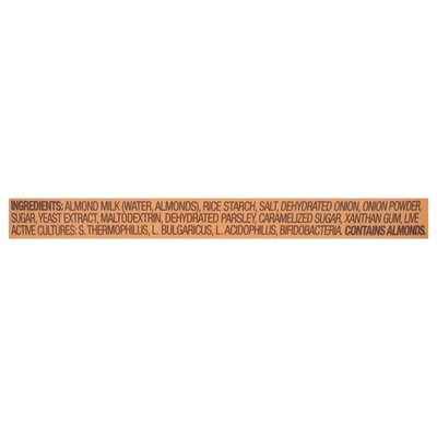 INGREDIENTS: Almond Milk (Water, Almonds), Rice Starch, Salt, Dehydrated Onion, Onion Powder, Sugar, Yeast Extract, Maltodextrin, Dehydrated Parsley, Caramelized Sugar, Xanthan Gum, Live Active Cultures: S. Thermophilus, L. Bulgaricus, L. Acidophilus, Bifidobacteria.