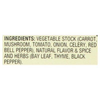 INGREDIENTS: Vegetable Stock (Carrot, Mushroom, Tomato, Onion, Celery, Red Bell Pepper), Natural Flavor & Spice and Herbs (Bay Leaf, Thyme, Black Pepper).