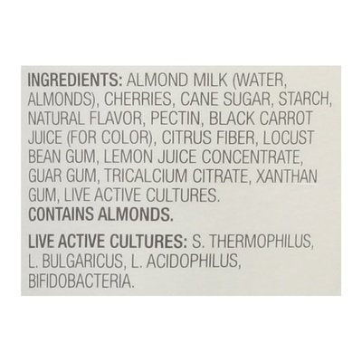 INGREDIENTS: Almond Milk (Water, Almonds), Cherries, Cane Sugar, Starch, Natural Flavor, Pectin, Black Carrot Juice (for Color), Citrus Fiber, Locust Bean Gum, Lemon Juice Concentrate, Guar Gum, Tricalcium Citrate, Xanthan Gum, Live Active Cultures. Live Active Cultures: S. Thermophilus, L. Bulgaricus, L. Acidophilus, Bifidobacteria.