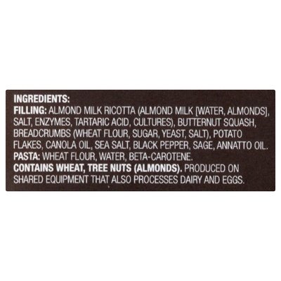 INGREDIENTS: Filling: Almond Milk Ricotta (Almond Milk (Water, Almonds), Salt, Enzymes, Tartaric Acid, Cultures), Butternut Squash, Breadcrumbs (Wheat Flour, Sugar, Yeast, Salt), Potato Flakes, Canola Oil, Sea Salt, Black Pepper, Sage, Annatto Oil. Pasta: Wheat Flour, Water, Beta-Carotene.