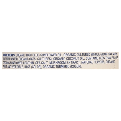 INGREDIENTS: Organic High Oleic Sunflower Oil, Organic Cultured Whole Grain Oat Milk (Filtered Water, Organic Oats, Cultures), Organic Coconut Oil, Contains Less than 2% of: Organic Sunflower Lecithin, Sea Salt, Mushroom Extract, Natural Flavors, Organic Fruit and Vegetable Juice (Color), Organic Turmeric (Color).