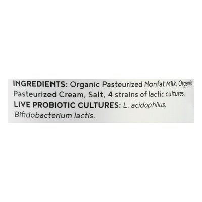INGREDIENTS: Organic Pasteurized Nonfat Milk, Organic Pasteurized Cream, Salt, 4 Strains of Lactic Cultures, Live Probiotic Cultures: L,Acidophilus, Bifidobacterium Lactis.