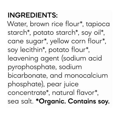 INGREDIENTS: Water, Brown Rice Flour (Organic), Tapioca Starch (Organic), Potato Starch (Organic), Soy Oil (Organic), Cane Sugar (Organic), Yellow Corn Flour (Organic), Leavening Agent (Sodium Acid Pyrophosphate, Sodium Bicarbonate, and Monocalcium Phosphate), Pear Juice Concentrate (Organic), Natural Flavor (Organic), Sea Salt.