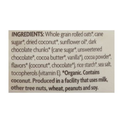 INGREDIENTS: Whole Grain Rolled Oats (Organic), Cane Sugar (Organic), Dried Coconut (Organic), Sunflower (Organic) and/or Soy (Organic) Oil, Fair Trade Dark Chocolate Chunks (Organic) (Cane Sugar (Organic), Unsweetened Chocolate (Organic), Cocoa Butter (Organic), Vanilla (Organic)), Fair Trade Cocoa Powder (Organic), Flavors (Organic) (Coconut (Organic), Chocolate (Organic)), Rice Starch (Organic), Sea Salt, Tocopherols (Vitamin E).