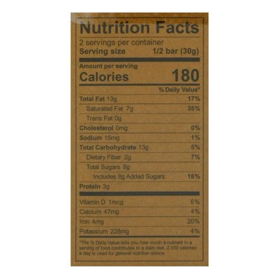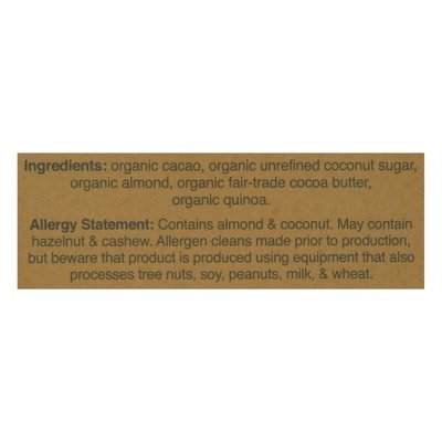 INGREDIENTS: Organic Cacao (Certified Fairtrade Ingredients), Organic Unrefined Coconut Sugar, Organic Almond, Organic Cocoa Butter (Certified Fairtrade Ingredients), Organic Quinoa (Certified Fairtrade Ingredients).