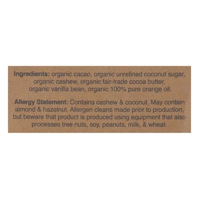 INGREDIENTS: Organic Cacao (Certified Fairtrade Ingredients), Organic Unrefined Coconut Sugar (Certified Fairtrade Ingredients), Organic Cashew Butter (Certified Fairtrade Ingredients), Organic Cocoa Butter (Certified Fairtrade Ingredients), Organic Vanilla Bean (Certified Fairtrade Ingredients), 100% Pure Organic Orange Oil.