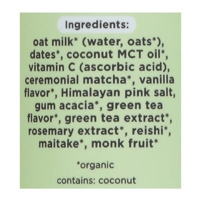INGREDIENTS: Oat Milk (Organic) (Water, Oats (Organic)), Dates (Organic), Coconut MCT Oil (Organic), Vitamin C (Ascorbic Acid), Ceremonial Matcha (Organic), Vanilla Flavor, Himalayan Pink Salt, Gum Acacia (Organic), Green Tea Flavor, Green Tea Extract (Organic), Rosemary Extract (Organic), Reishi (Organic), Maitake (Organic), Monk Fruit.